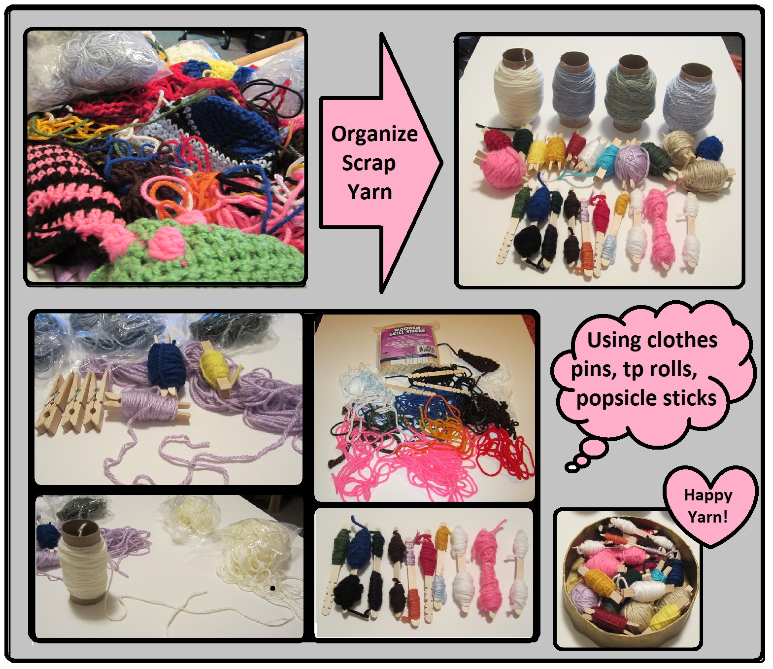 Here’s what I did this weekend for Project Marathon Saturday! I tried it all and I love the way it’s working out! For the extra tiny yarn scraps I used notched popsicle sticks that I got in the craft section of Walmart so that there are lots of places to stick the ends of the yarn and keep it from sliding out-of-place. I think normal popsicle sticks wouldn’t have a way to keep the little pieces of yarn on there unless you add a rubber band or something like that, so I’m glad I found these!
