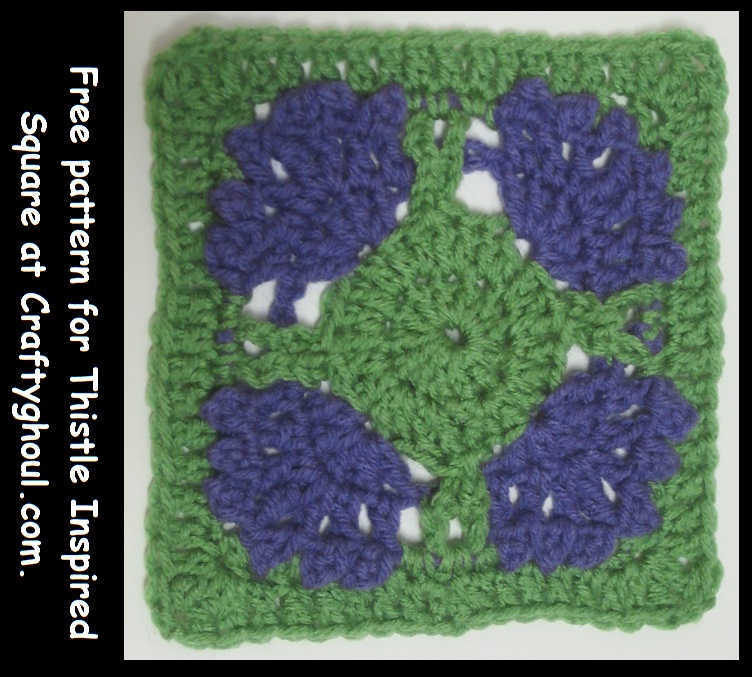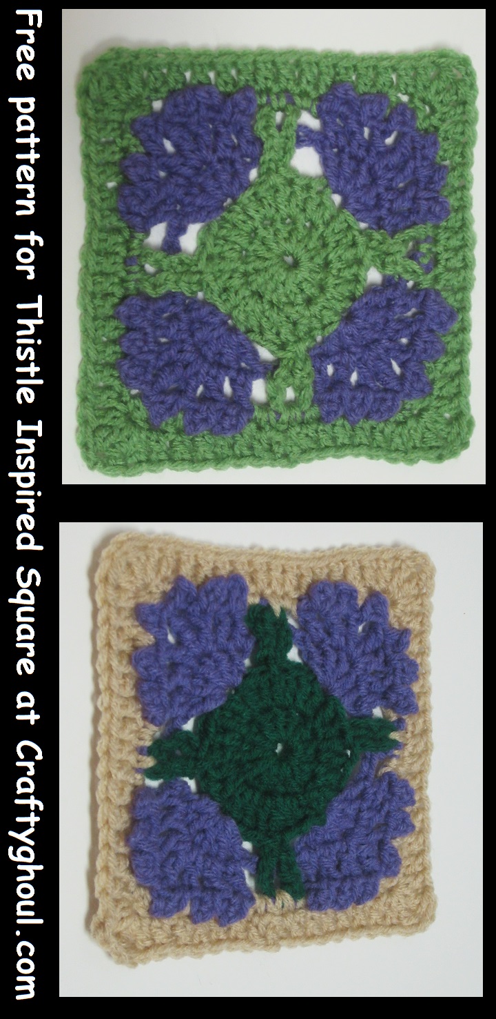 Okay, I got it in my mind that I needed a thistle square pattern, and everywhere I looked I could find nothing other than some kind of thistle-stitch or something like that, ha! So I sat around tinkering until I finally came up with this one! The first lighter green square I added more chains in round two than I state in the final pattern. (Those chains make up the four sides of the celtic-looking cross shape that makes the center of the thistle.) So throughout the pattern they look more loose than they will be for you, but I realized that the looser version made it easier to explain where to put the stitches so you can actually see what I did. If I didn’t find a way to extend the green from round two outward into the next two rows then the purple of the flowers kept blending in with one another and not having as much of a solid thistle-shape that I was wanting. So that’s why it’s done the way it is, and behold! Thistle Square!!! It’s a simple concept, but I pretended it wasn’t and took lots of close up pictures to detail it out just in case anyone is confused. Happy thistlin’!