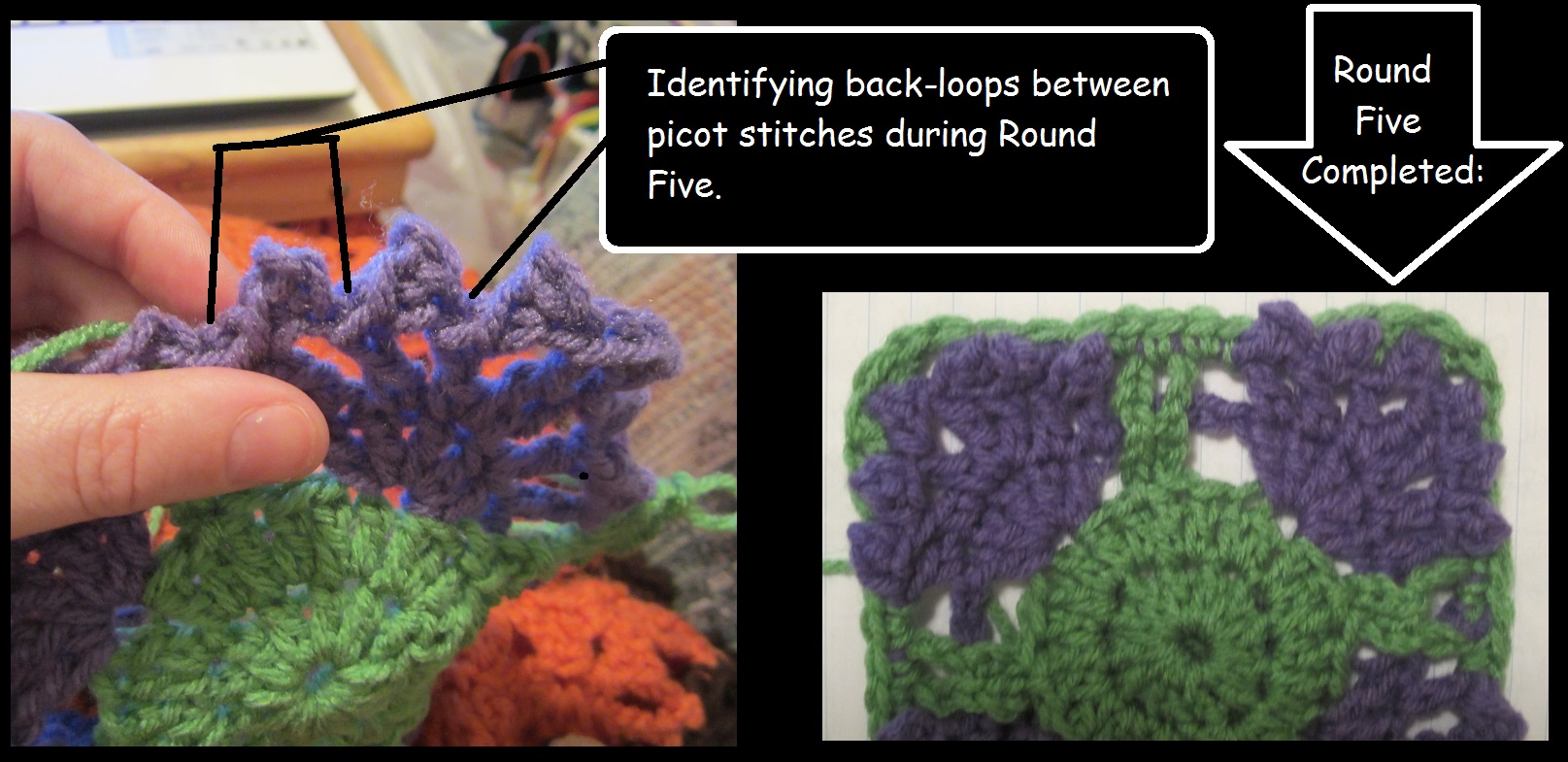 Rnd 4) Ch 2, sl st in the back of the very top center chain of the double loops from Rnd 2. (If you want to be extra picky about the flow of the square you can fasten off after Rnd 3 and join with a sl st in this spot instead of using this ch-2 join method. I just did that because I hate extra ends to weave in.) *Ch 1, (dc, picot) in the first st after that. (The beginning edge of the petal.) dc, picot, (dc, picot, tr, picot, dc, picot) in center st, dc picot in next st, dc in last st of flower, ch 1, sl st in top of double chain loop from Rnd 2. Repeat from * three more times. Fasten off purple.