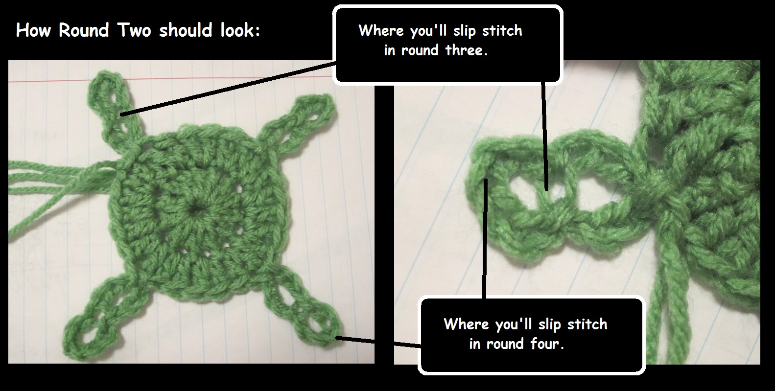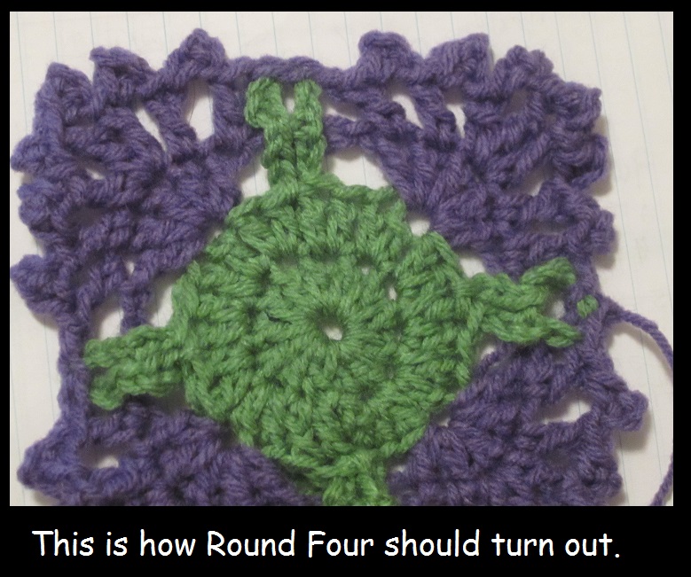 Rnd 2) Ch 2, 2dc in same st, 2 dc in each of the next 2 st, (ch 7, sl st in the 4th ch from hook, ch 2, sl st in top of same dc, 2dc) in next st. (That makes the dc that you will be using in rounds 3 and 4 so that you don’t have to use the purple. You’ll simply sl st in the bottom circle of this chain in Rnd 3 and use the top circle for Rnd 4.) *2dc in each of next 3 st, (Ch 7, sl st in the 4th ch from hook, ch 2, sl st in top of same 2dc) in next st. Repeat from * 2 more times. Join with a sl st in first dc. Fasten off green.