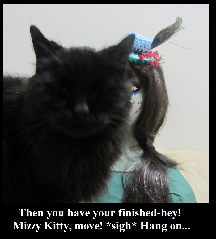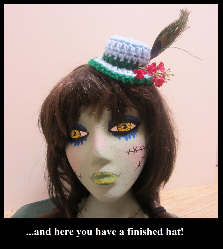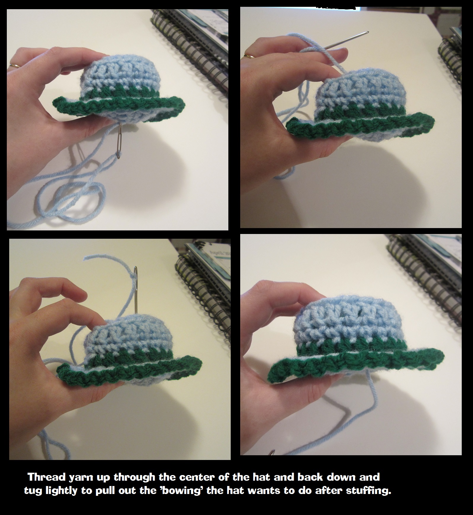 Stuff the hat with cotton, or if you prefer it to be more stiff, I find that the flower arranging section at the store usually has all kinds of stiff, cylindrical shapes that you could saw down to size with a steak knife, haha! So just be creative! I find stuffing works just fine for me, though, and at the very end, I thread a bit of yarn from the bottom of the hat, up out the top of the hat, and then loop it back to the bottom and tie it so that it pulls the top of the hat into a better, more firm shape. Then I can stuff it more without worrying about it bowing up on top. (Image Six and Seven)
