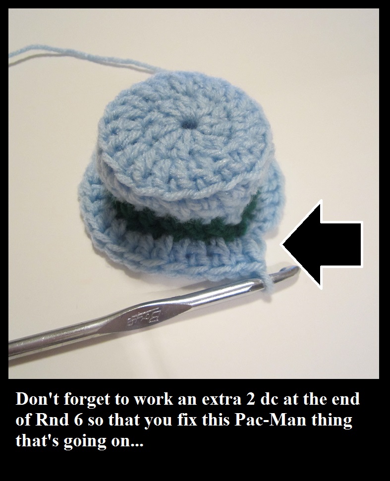 Repeat Rnds 1 and 2 and then fasten off after round 2 leaving a tail long enough to sew the circle to the bottom of the hat. (Image One)