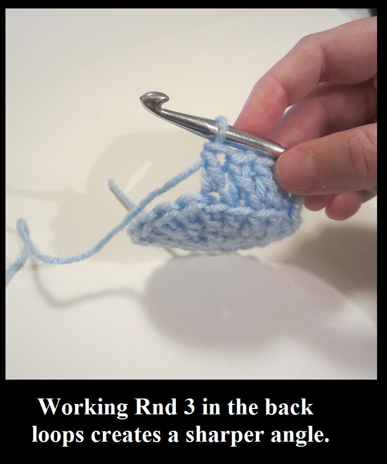 Rnd 3: *Now we’re making the sides of the hat, so for this row you will work in the back (bottom) loops only to cause this row to more easily make a sharp angle rather than a rounded edge.