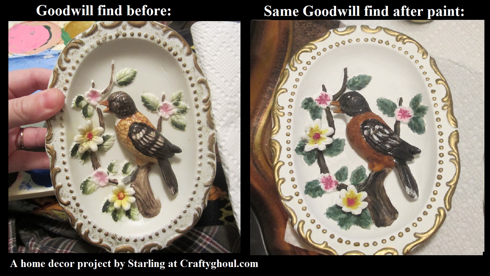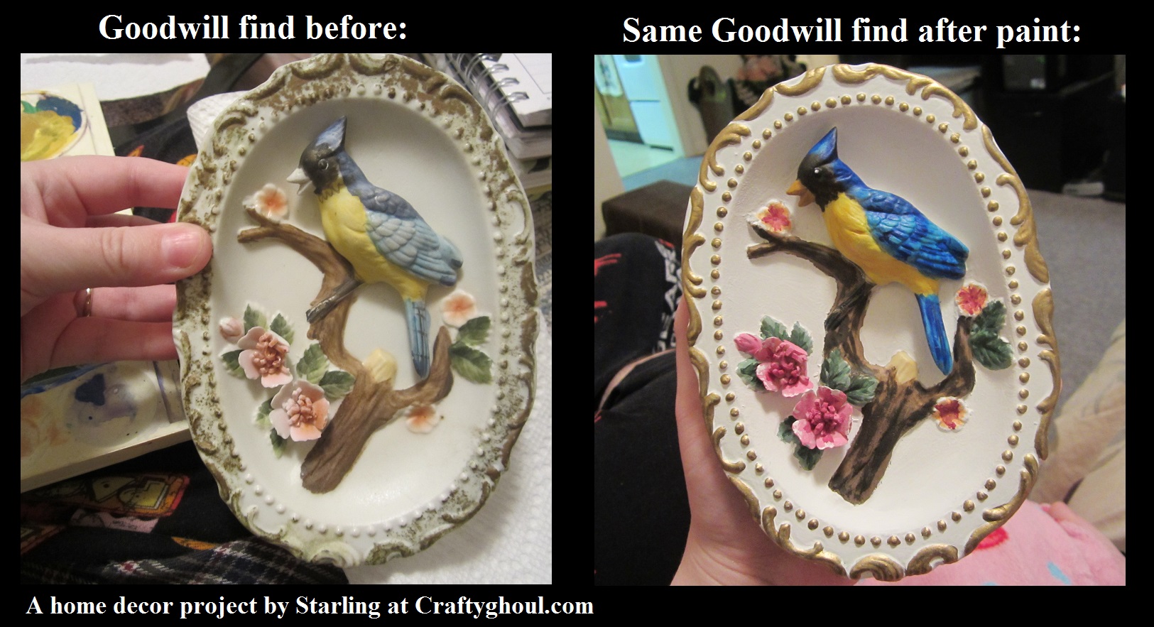Check it out! I found two hanging bird wall decorations at the Goodwill, washed them, and gave them a new coat of paint! They’re going to look great in our living room with my bird and lush nature theme going on! I put the before and after pictures right next to each other so y’all can see the difference! I’m so proud of my painstaking detail work, lolz!