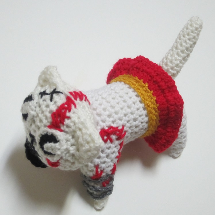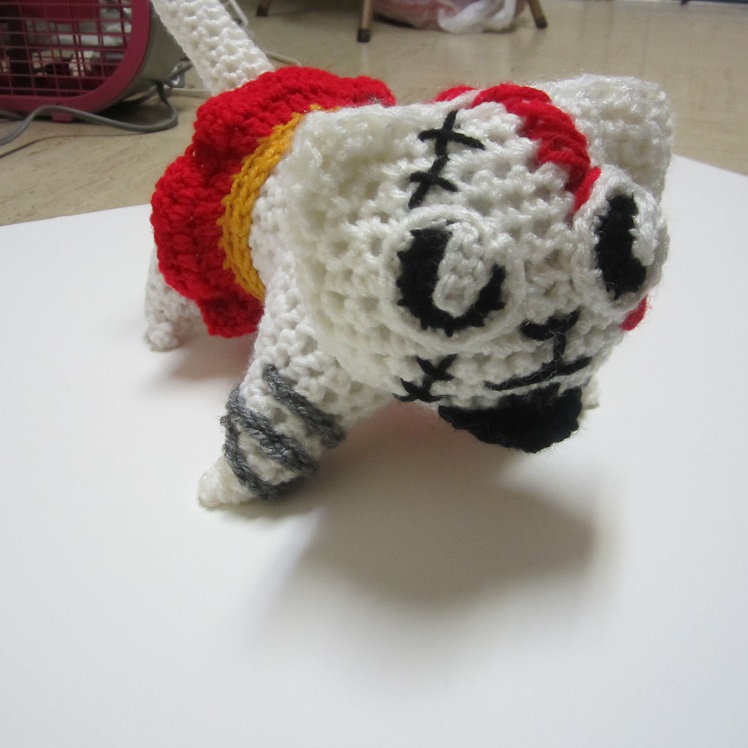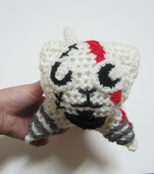 I made this lil’ crochet kitty from a free pattern you can find here. Then I dug up a whole bunch of Kratos inspiration pictures (from the video game God of War) and set to work adding all the extra detail! Valtiel is really happy with his Kitty of War gift! Behold!!!!!