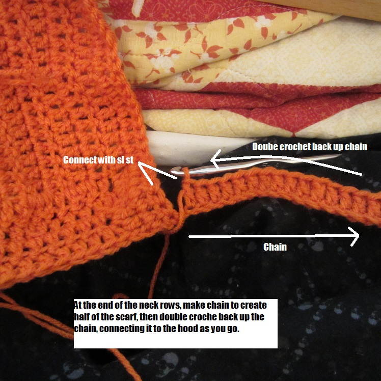 At the end of Rw 4, ch 63. Dc in 3rd ch from hook and back up the chain until you reach the edge of the hook. Join the top of your row with a sl st to the hood. Sl st a time or two along the hood until you are even with creating a second dc row back down the scarf. Then dc back down the scarf. Once you’re back to the end, ch 2, turn and dc back up the chain to the hood one last time. Sl st the top of your row to the hood. Fasten off and weave in ends. You should have one side of your scarf that is three dc rows tall.