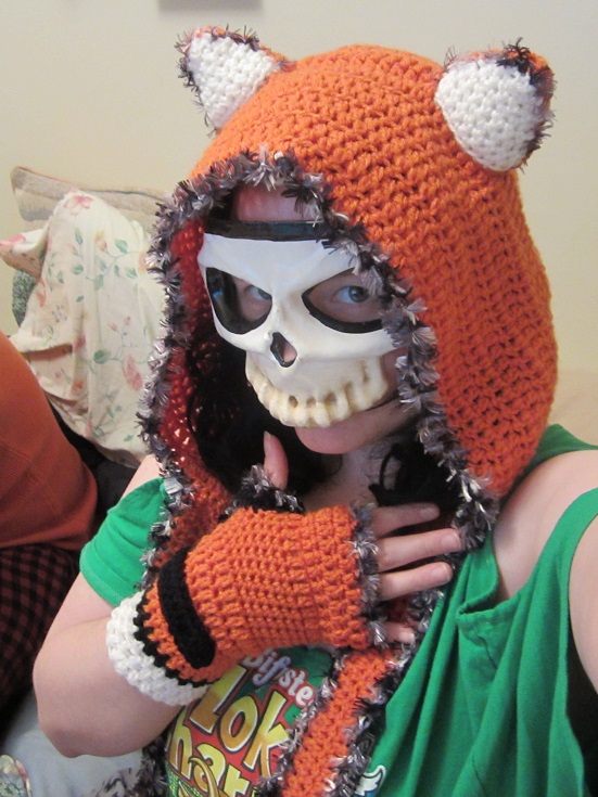 There you have it; an adorable fox scoodie! I’m going to have to get on the ball and load up the fingerless gloves pattern sometime!