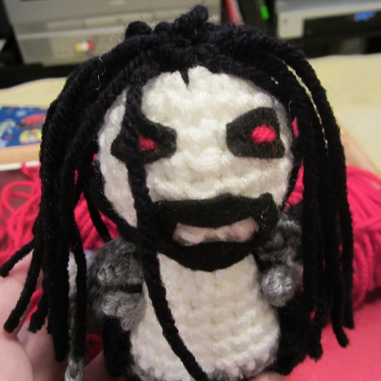 I made a crochet Lobo inspired by his character in the video game Injustice: Gods Among Us for one of our friends for a Christmas present! He turned out great! I’m so proud! I even added his shoulder spikes! I used the body pattern from the Creepy Cute Crochet book and just kinda made the rest up as I went along!
