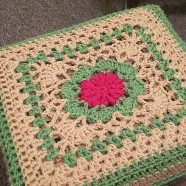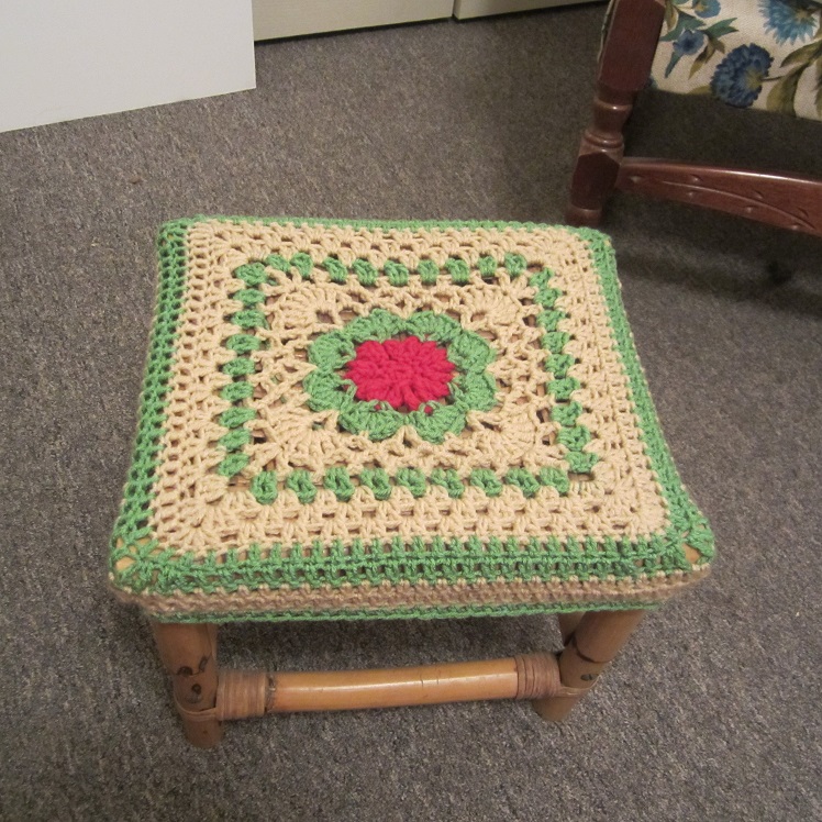 I can NOT find the free pattern for the square that I used as the center of this foot stool, but I found a free square pattern online for the center of this project. To make the square large enough to fit, I simply started adding double crochet granny square-type rounds until it was wide enough, and then worked the rows with the exact same amount of stitches to make it go straight down the sides of the stool. (Meaning that in the corners I stopped doubling up the stitch clusters and treated them the same as I worked along the sides so it would stop getting larger and instead stay the same width. That’s how I make my hats, too. I work a wider and wider circle outward until the hat is as wide as I want it, and then I work straight down like I’m creating a cylinder shape.) Finally to make it a little more tight, I added a single crochet round or two.