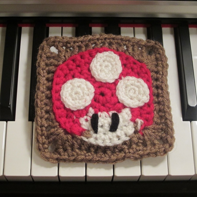 Rnd 7) Turn work. Work in the back loops only in this round to make your mushroom appear a little more 3 dimensional! Your mushroom should now be right-side-up. Jn your background color with a sl st in the same st as the ending join in Rnd 6. This should be a background color stitch that you’re joining it to. Ch 1, hdc in same st. In next st create your first corner, (2dc, ch 2, 2dc), hdc in next 8 sts. Repeat from * 3 more times except leave one hdc off of very last 8 sts, so do 7 sts instead of 8. Jn with a sl st in first hdc.