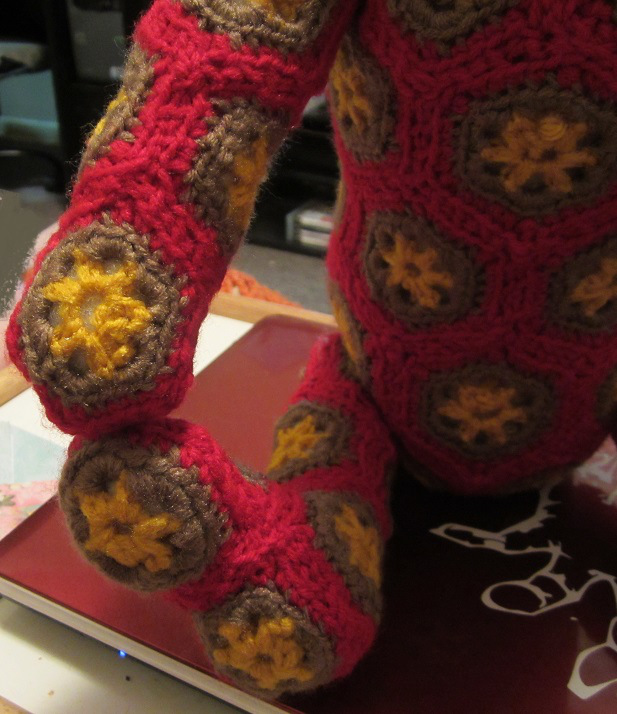 The construction of the head, I feel, can only be explained by looking at pictures of the head and placing the squares, hexagons, and pentagons where you see them. I will add pictures of the head so that you can see where to put the shapes. Since they’re all made with the same hook size, all you really have to worry about is placing them correctly.