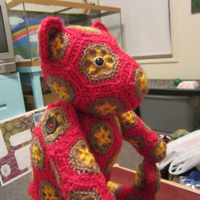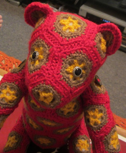 I made these hexagon, pentagon, and square patterns, because I am a lazy crocheter, as my ghoulz know, and I have a lot of pain in my joins and my vision is bad, so I loath trying to work with tiny hooks and tiny yarn. Hopefully these shapes will be large enough for all my achy-ghoulz out there not to go cross-eyed. I use only 3 hook sizes: a G hook and an F hook, (and briefly an H hook with 2 strands of yarn held together to make the paws curve, which you could substitute with the G hook if you really want). Again, I use these larger hooks so they’re easier to see and work with. I like bigger hooks; what can I say? Instant gratification pleases me! You can probably alter any hexagon patterns you find out there to make interesting hexagon critters like our grandmas used to make as long as you have a matching size hexagon, pentagon, and square pattern. I don’t add any construction images here because I decided to go for this as a pattern rather than a tutorial. The reason I made this pattern is because I created the bear for my mom as a Christmas gift and I’m always wishing people would jot down what they do as they go along when they make random patterns so that they have a reference to give when people say, “Ermegersh! How do I make mine?!” It’s really not as complicated as it looks. I’ll tell you the number of shapes for each body part and I have faith in you! You can figure it out just like I eventually did! What I did was make all my shapes and then I sewed them together later. If you are insecure about how to connect them, simply do what I did while playing with it and don’t tie a zillion knots in your connecting yarn so that you can just pull it all out if you get it all together and then realize you have one backward shape, lolz! (That happened to me quite a few times…)