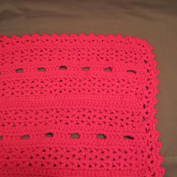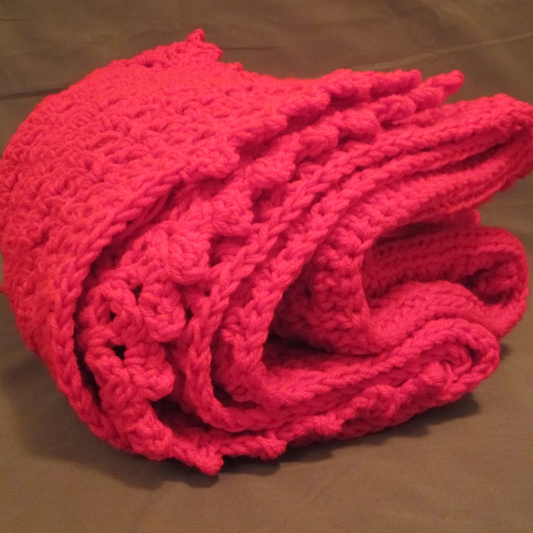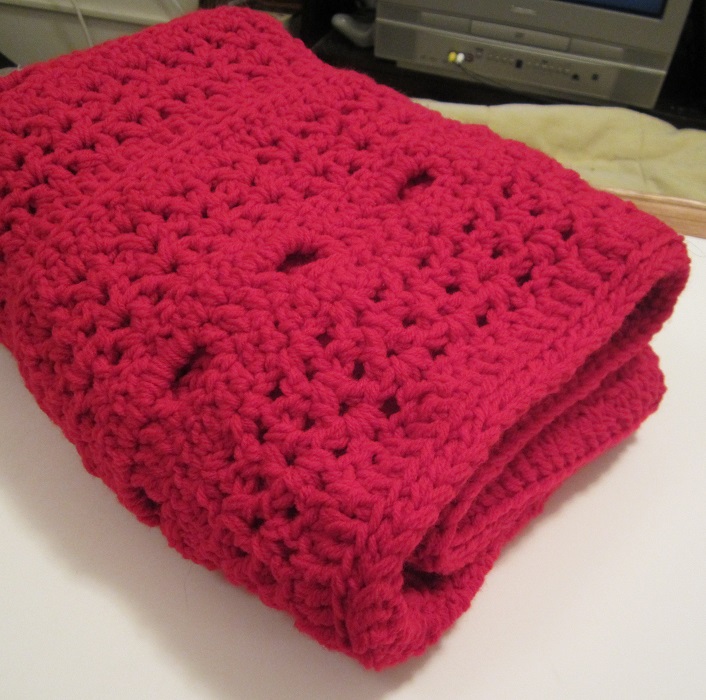 Note: Chunky yarn can be really expensive, but I luvz the instant gratification and the cozy warmth that comes with chunky projects, so I often times use 2 strands of Red Heart Super Saver Yarn. This blanket took me about 2 skeins per 2 strips…so about a skein per strip. It was difficult to tell at first since I use two skeins at the same time. Another reason I worked in strips instead of working straight up the blanket is because I hate it when I’m off on my prediction of how much yarn I’m going to need, and then I finish 1/2 or 3/4 a project and then the store suddenly doesn’t carry that color anymore. This way I can sew the strips together later, so if I wind up picking a complimentary color instead of working right through, I only wind up remaking one or two strips if any at all. I also join the strips later because I love the textured effect of using the back loops only when I join them.