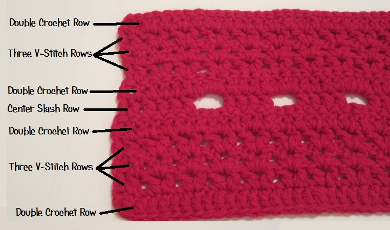 Rw 6 ( Center Slash Row): Ch 2, turn. Dc in next 2 st. (Ch 3, sk next 3 st, dc in next 4 st) across to last three stitches, sk next dc, dc in next st and dc in the top of the ch-3.