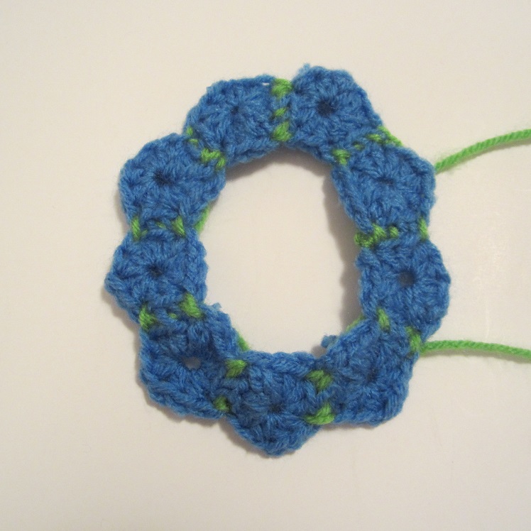Working in back loops only, jn yarn with a sl st along the bottom of the project. Ch 1, hdc in same st as jn. Hdc in each st around, and in each of the the places where two shapes are joined you’ll treat the corners as one hdc by doing a dc decrease bewteen them. After that I add two more hdc rounds, joining each round with a sl st in the first hdc. Do not fasten off after last round.
