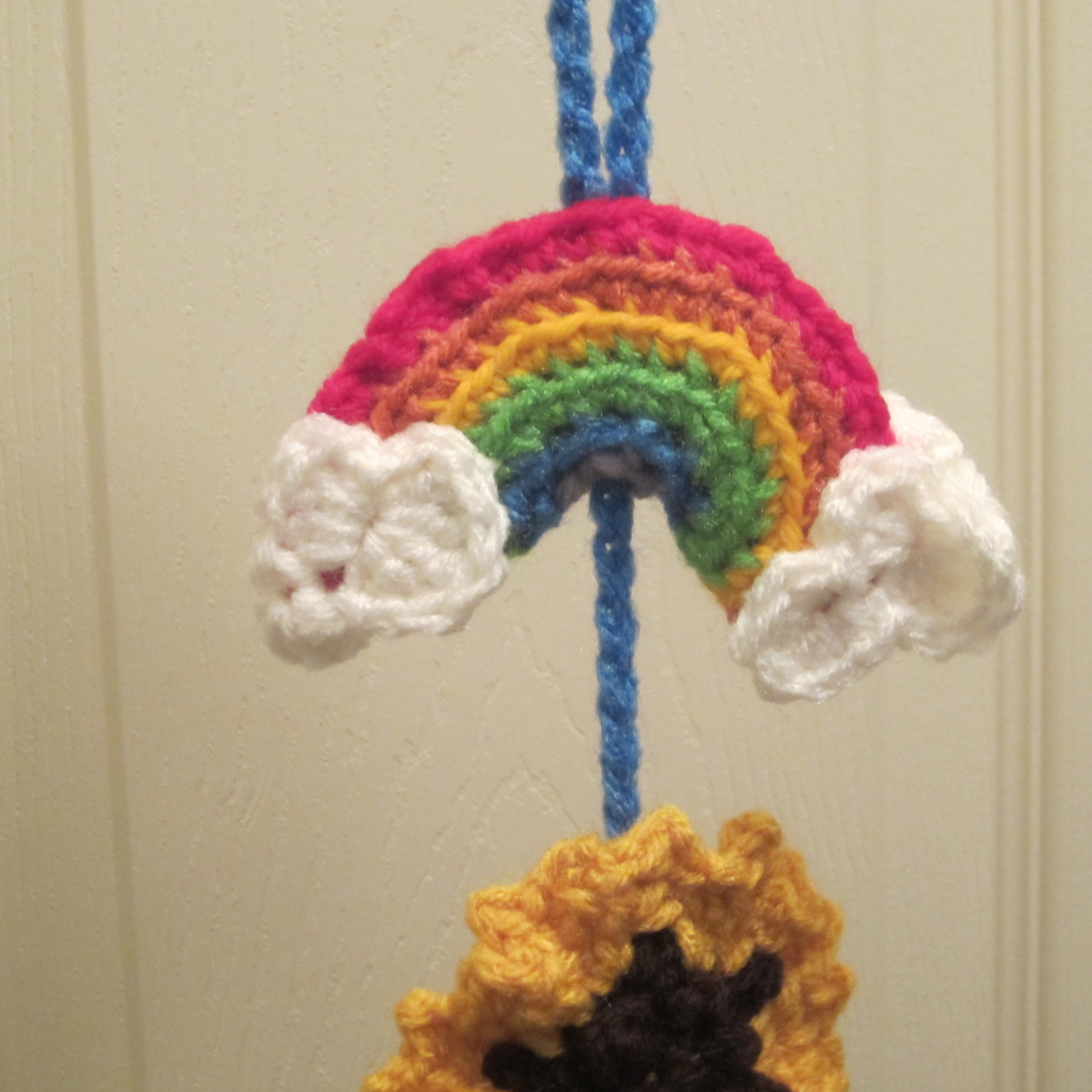 Rnd 6: Ch 1, (sc in next 6 ss, 2sc) around. Jn with a sl st in first sc. Fasten off leaving a tail long enough to sew rainbow together around the edges when you fold it in half. Feed the handle through the center of the rainbow, then fold it in half and sew it in place