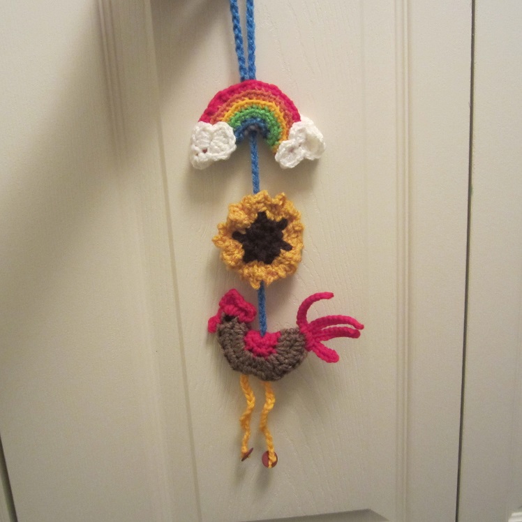 I use an F hook, a K hook, a yarn needle to weave in the ends and sew the pieces in place, and Red Heart Super Saver Yarn. I’ve added the sunflower pattern below for the summertime rooster charm shown above as well. Both roosters are done with the same pattern and different colors.