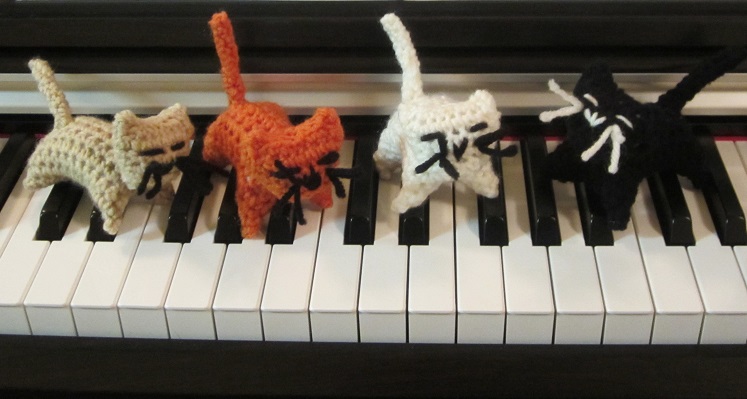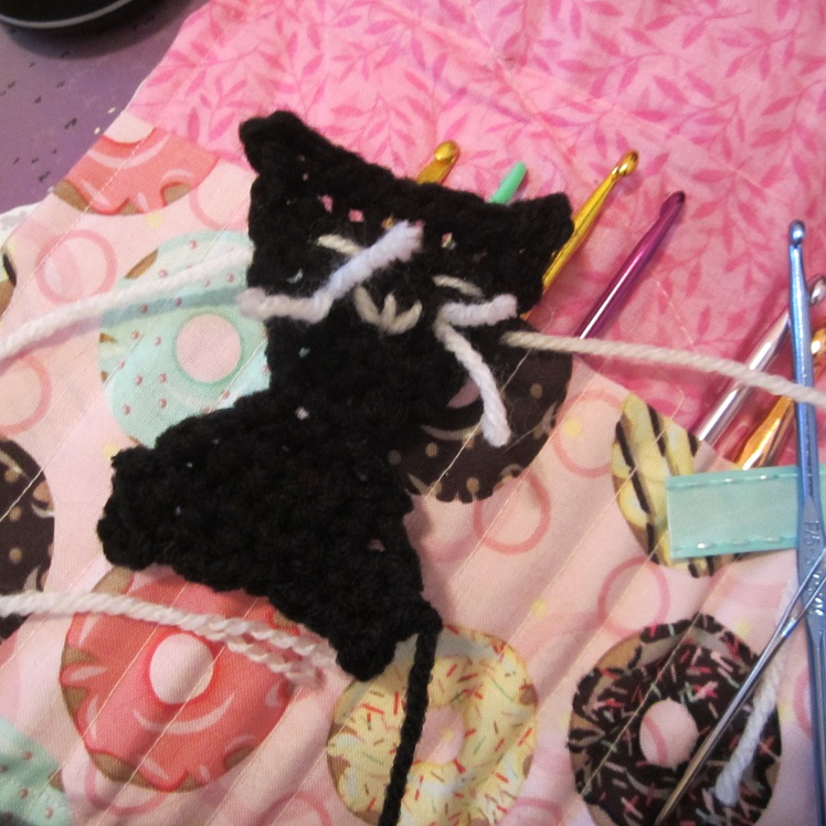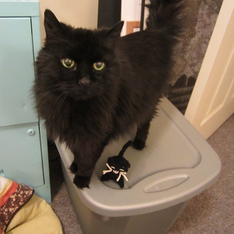 Ch 9, sc in 2nd ch from hook and across, ch 1 sl st in same ch, pivot work, ch 1, sc in same chain and back up the chain. Fasten off leaving yarn long enough to fold the tail in half long-ways and seam it up and then sew the tail to the body. The two rows folded together will make sure the tail will be stiff enough to poke straight up like a curious kitty.