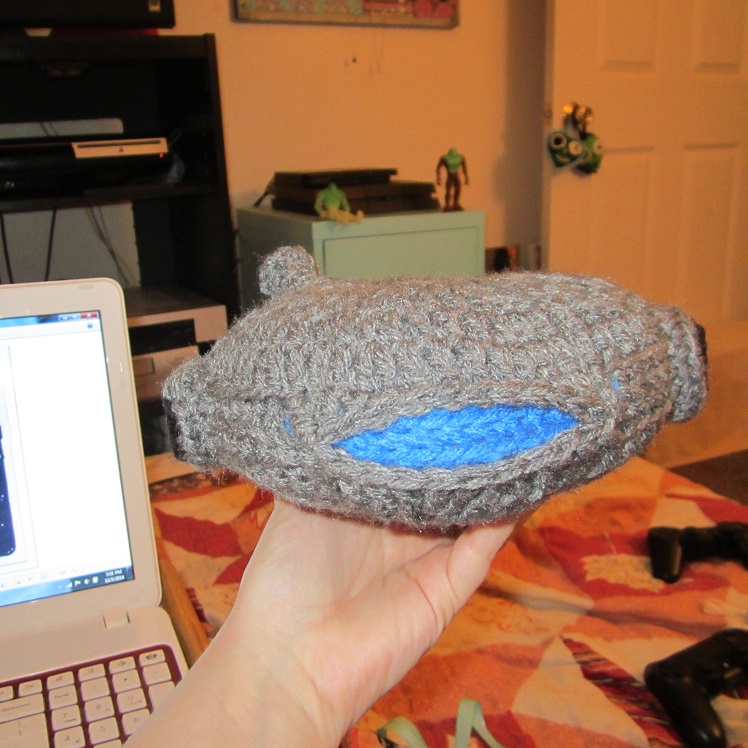 Once you’re done with the ship accessories, sewing the part together, and adding accents, then you can make one last gray circle for the top center of the ship, and that will cover up the center where you threaded through all of the ‘lines’ to add shape to the ship. For this circle all you need to do is repeat the first two rounds of the ship body with gray: